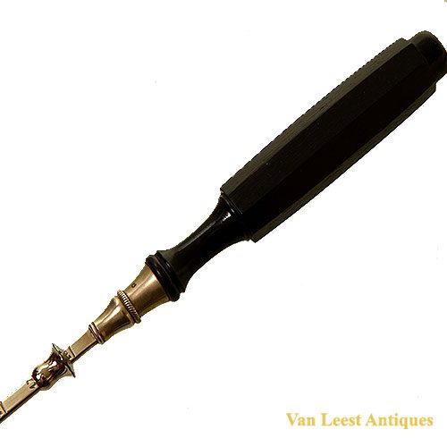 A steel dilatator with an octagonal ebony handle. On the working part of the dilatator is a scale from 4 to 18 cm with a moving ring. Total length 29 cm and in perfect condition. C 1860