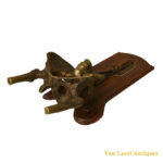 An Tarnier’s articulated bronze female pelvis and sacrum, last quarter 19th century, signed on the calibrated scale “ Baldinelli Milano.”. The remarkable realistic bronze pelvis measures 25 x 25 x 10cm overall, and is mounted by two steel pillars to a 23 x 51 cm wooden backboard. A bronze sacrum (the lower end of the vertebral column) is hinged to the board with a steel linkage and guide rod indexed against a linear scale graduated from 3 to 11 by halves, indicating the anterior / posterior diameter. Condition is very fine, noting one short break in the board, Total weight is 30 pounds!