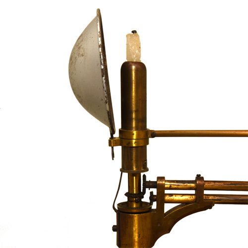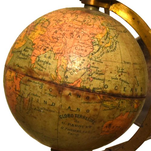 A complete and original Tellurium for the Italian market with a G. Parquet – G. Thomas edit. Paris terrestrial globe. The 3-inch diameter terrestrial globe signed: Globo Terrestre da G. Parquet – G. Thomas edit. Paris, made up of two sets of twelve coloured printed gores and two polar colottes. Mounted with a rotating arm and white painted wooden moonball atop the engraved brass meridian half circle with on top aluminium disc with the moon time. The gears arranged to rotate the earth and the moon on two long brass arms, as well as the blued iron hand which indicate a small printed aluminium hour dial. The other end of the arm rotating on an axis with original candle holder and reflector, above an oval plaque showing the days of the month, degrees and the seasons of the year with equinoxes and solstices marked, the houses of the Zodiac and compass directions. All in the Italian language. Mounted on a walnut wooden cabinet standing with a compass and the brass turning handle The tellurium is in good working condition. A simular instrument by Delamarche is in the collection of the National Maritime Museum.
