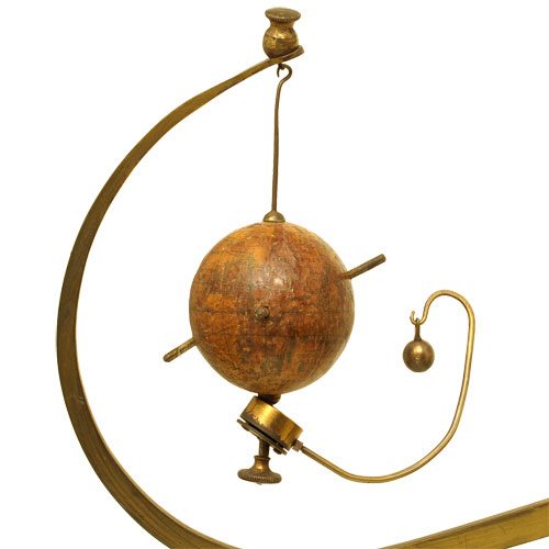 Cosmographe or tellurium patented by Garassul Paris and made by H & Cie. A hand-operated French tellurian, 3rd Quarter 19th Century with no gears, probably a handmade device, not manufactured or mass-produced. Its unique features, which do not appear on any manufactured tellurian we know of, include rods that emanate from the earth and incised lines on the sun. The wire rods from the earth probably indicate the 23.5-degree tilt of the earth on its axis. The incised lines and rods in the sun apparently indicate the celestial circles and the zodiac.