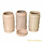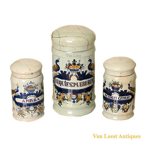Ten apothecary jars made by ‘De Drie Klokken’. These jars were made in the blue Delftware era from this company. The decorations on the jars around the names have a peacock motif crowned by fruitbaskets. C. 1800. The heights of the jars are 14 cm(two small ones), 21 cm(six medium ones, with lid), 27 cm(two large ones). There is a possibility to buy a part from this collection as well(for example only the two big jars).