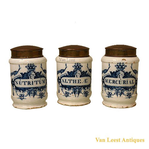 Three Delft cylindrial pharmacy jars with a copper lid, decorated with Peacock motif. Measurements: diameter 11 cm and 19 cm high;