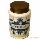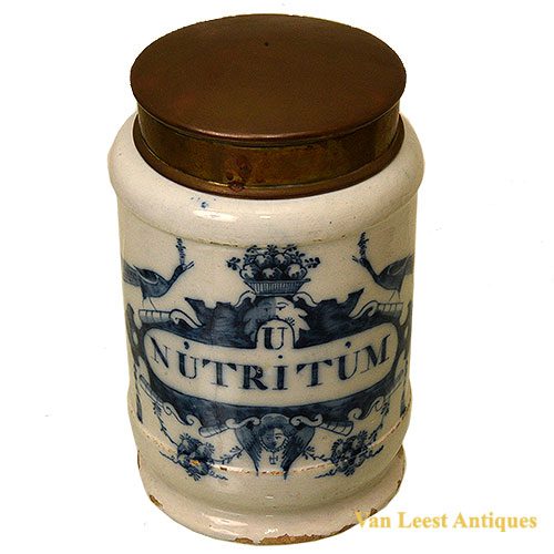 Three Delft cylindrial pharmacy jars, copper lid & peacock motif