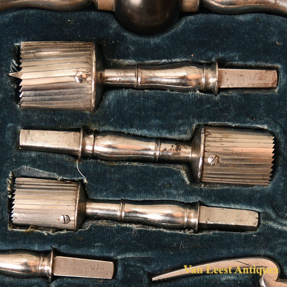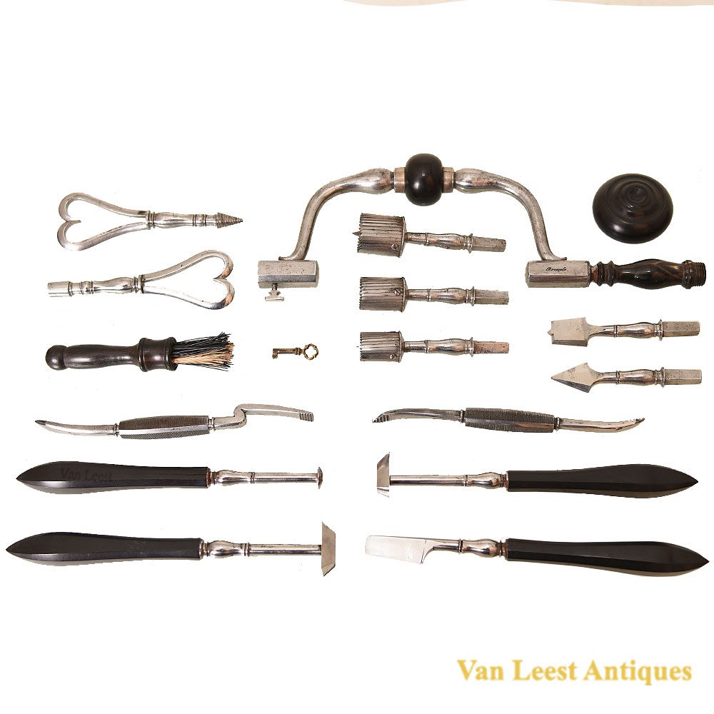 A complete trepanning set in case by Bonneels à Bruxelles of circa 1840. The case is made of leather and wood with a blue velvet interior and can be locked with its original key. The set contains 16 pieces, including one trephine with ebony ferrule and turned ebony knob, one small puller, one key to adjust the trephine axis, one ebony bone splinter brush with boar bristles, five polished steel interchangeable trephine heads, two metal elevators, four lenticular knives with faceted ebony handles. All the instruments are carefully made and decorated of polished steel.