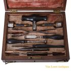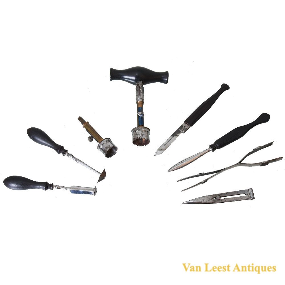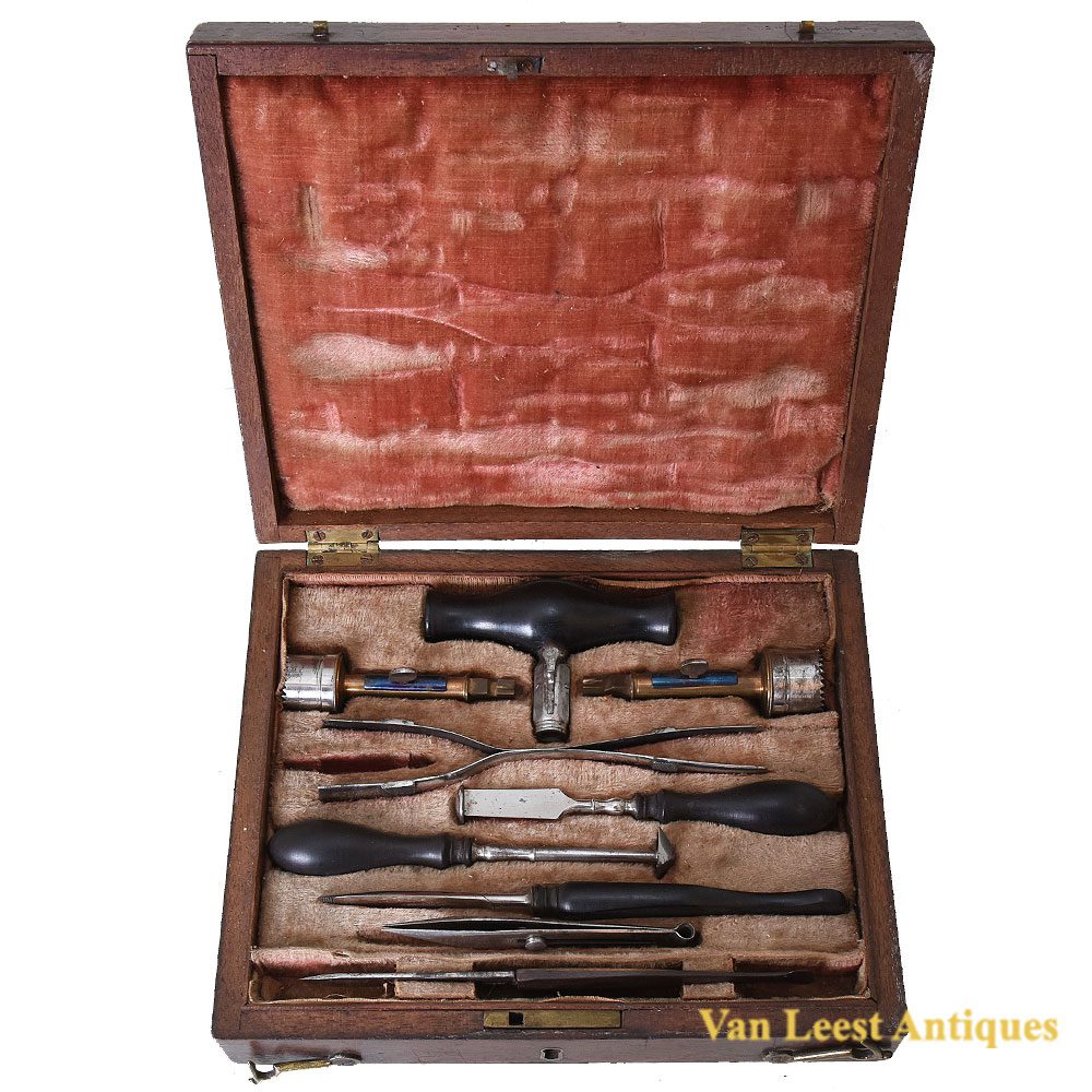 English cased trephination of the late 18th/early 19th Century. The nine instruments are made of steel with ebony handles. Including a handle and two trephines, a double-ended spring forceps, two lenticulars, an elevator, tweezers and a scalpel by Wight (latter two additions), contained in a fitted, plush-lined, mahogany case