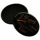 Two different Papier Mache black painted French dentifrice boxes with the following discription;