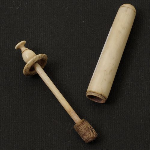 A late 18th century vaginal tube that was finely carved out of bone and had a perforated, threaded screw cap. It is a vaginal syringe used for douching. Length 9 cm