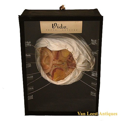 A wax model of the ear, wrapped in a cloth. All the parts of the ear are shown, with description on the side in spanish(connected with small ropes). This model is called “Oido corte interno” in spanish which means “internal cut ear”. The box is made of wood and there is a glass plate in front of the model to protect the wax. The object is estimated around the end of the 19th century and is fabricated in/around Barcelona. Measurements: 25 x 18 x 11 cm.