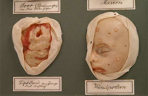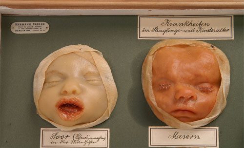 Six baby- and children’s diseases, mounted on a plaque with wood frame. The little faces showing all the awfull symptoms of the six diseases; written in german ,soor, masern,diphterie, windpocken, scharlach and pocken.( sprue, measles, difteria, chickenpocks, scarlet fever and smallpocks) signed by ‘hermann eppler, atelier fur plastische anatomie — und lehrmittel anstallt–berlin nw, emdenerstr.19. M.40x28x6cm ,