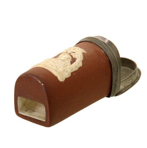 A very special wedgwood tooth brush sheath of porcelain with a tin lid, circe 1850. The scene on the front of the sheath is typical wedgwood. In good condition and dimensions amounts 6 x 3 x 3 cm.
