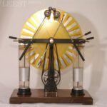 The wimshurst machine is a historical electrostatic machine for generating high voltages, and was developed between 1880 and 1883 by british inventor james wimshurst (1832-1903). It is an electrical generator with a distinctive appearance, having two large contra-rotating discs mounted in a vertical plane, two crossed bars across them, and a spark gap formed by two metal spheres.
